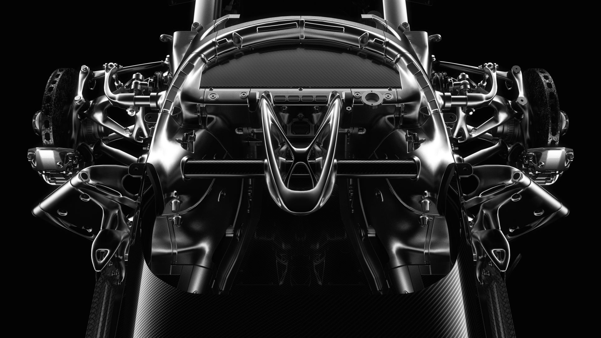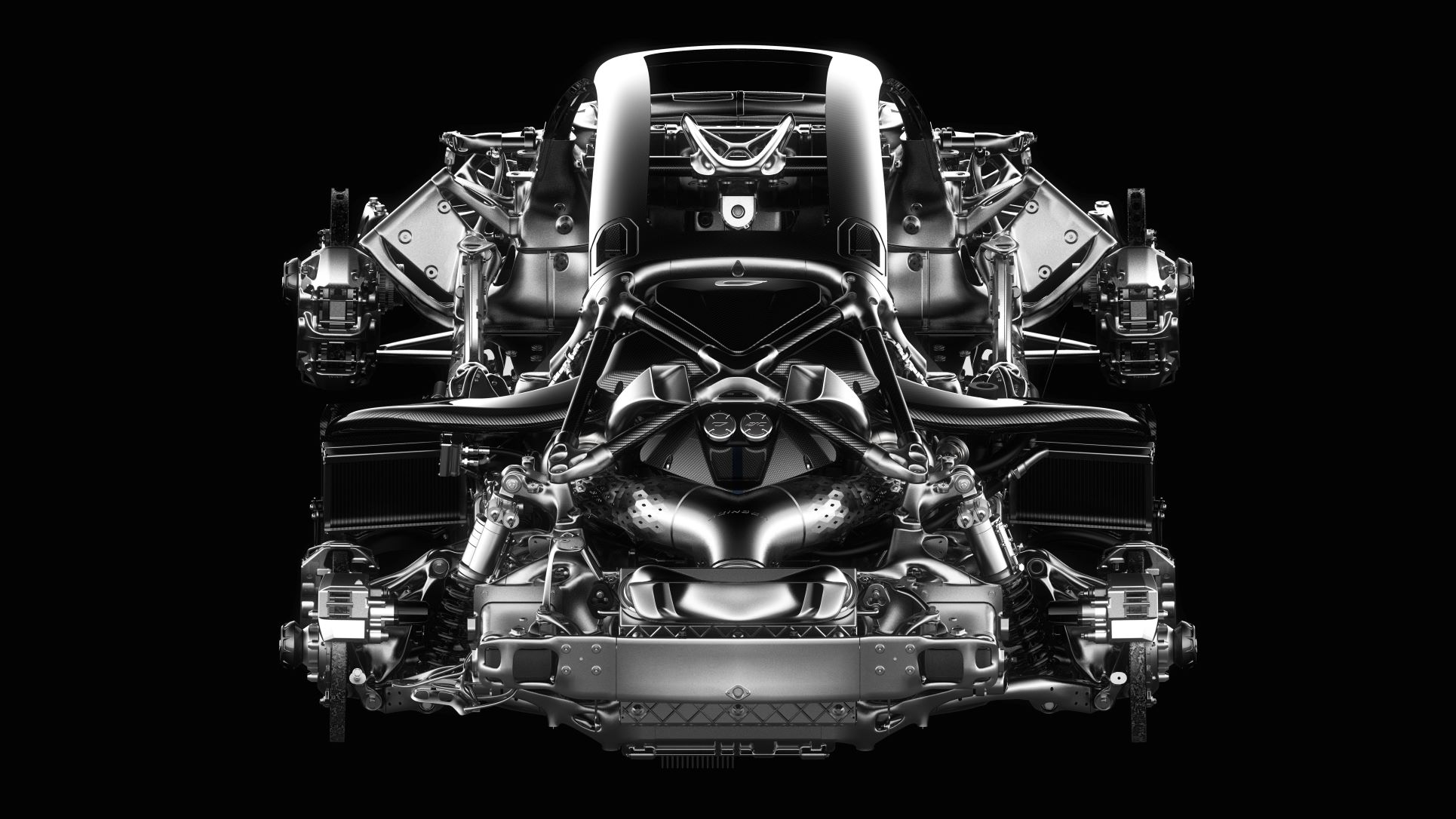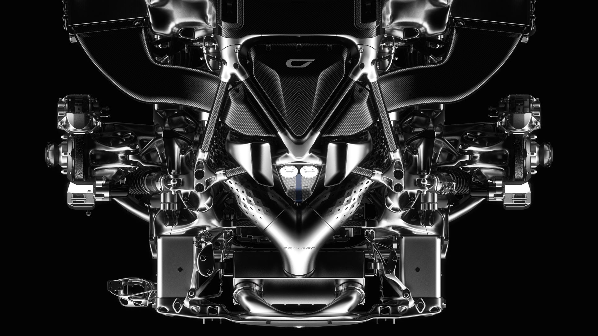 The mid-mounted 2.88-L twin-turbo V8 is engineered to use a range of fuels, including carbon recycled methanol and other “e-fuels,” so it can be run as a zero-emissions vehicle. Engine specs include an 80-degree bank, 73-mm (2.87-in) turbos, an 11,000-rpm redline, 84 x 65 mm (3.31 x 2.56 in) bore x stroke, and a 9.5:1 compression ratio.