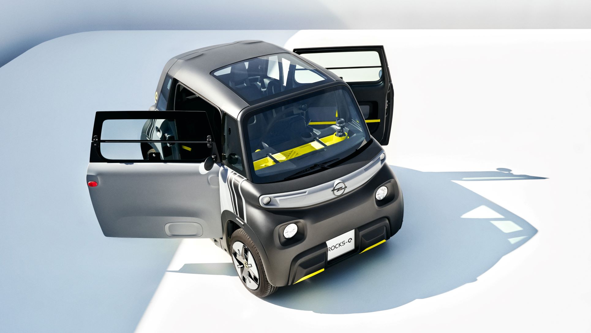 The Rocks-e features the new Opel Vizor brand face with LED headlights and indicators. The doors on both sides are identical, with the passenger door swinging forward and the driver’s door swinging in the opposite direction.