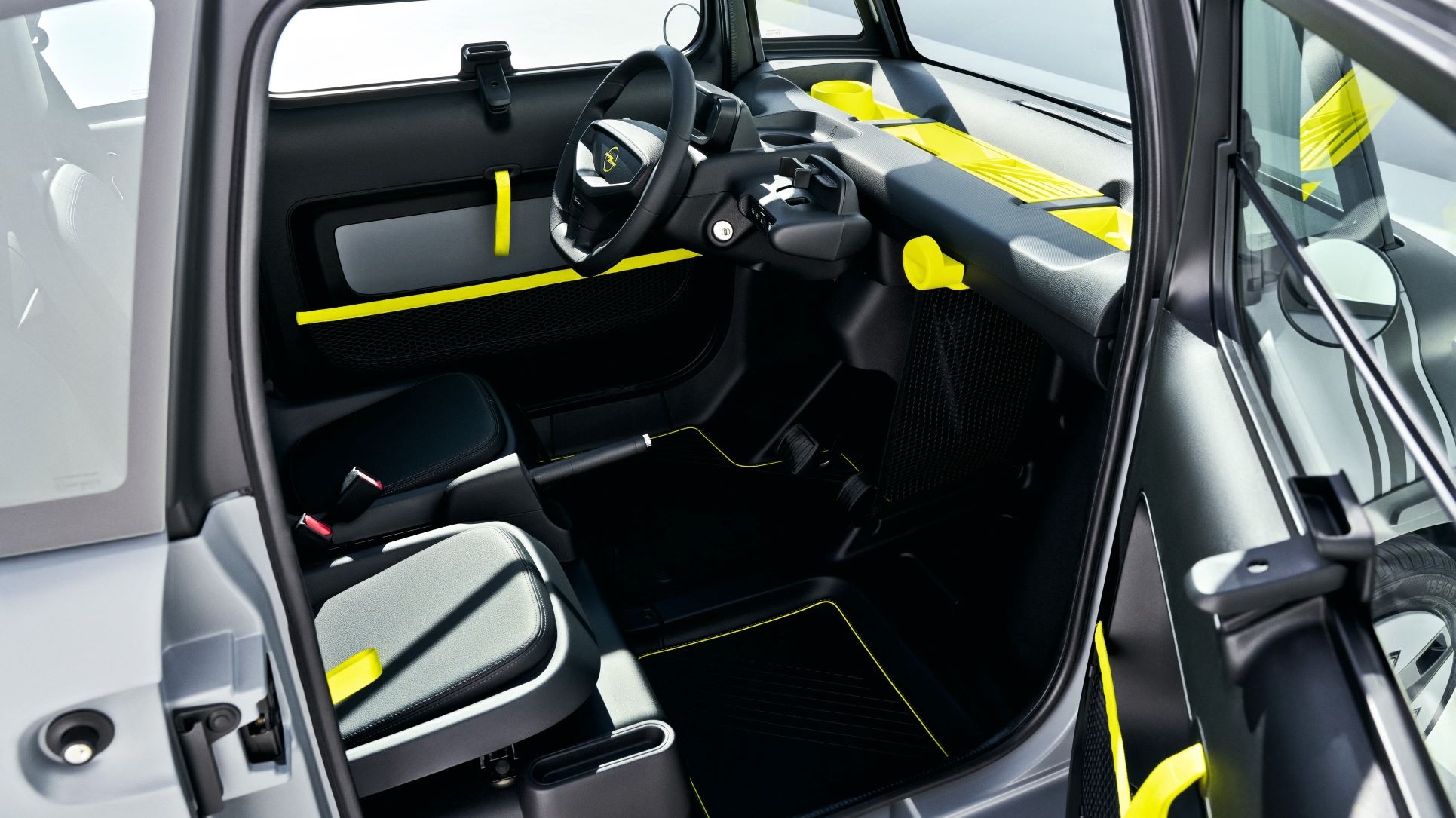 Inside, the two seats are offset, with the passenger seat set for legroom and the driver’s seat adjustable lengthwise. Good all-round visibility is provided by large windows and a standard panoramic glass roof. Despite its compact dimensions, Opel says headroom is ample, even for people more than 1.90 m (6 ft, 2 in) tall, and luggage volume of up to 63 L (2.2 ft³) is available in the passenger footwell.