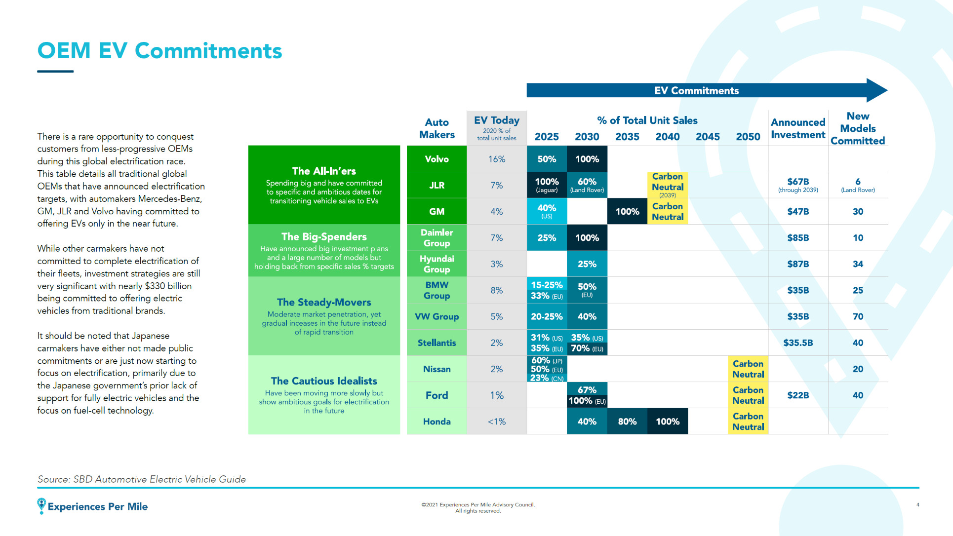 Some traditional global OEMs have announced electrification targets, with automakers Mercedes-Benz, GM, JLR, and Volvo having committed to offering EVs in the near future. While other carmakers have not committed to complete electrification of their fleets, investment strategies are still very significant with nearly $330 billion being committed to offering electric vehicles from traditional brands.