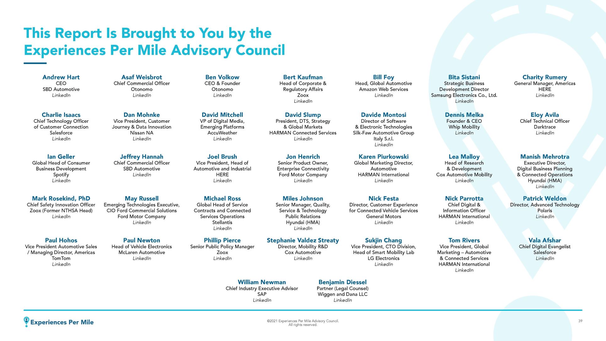 In early 2022, the EPM Advisory Council will release the results of an EPM Metric Exploratory Research Study which will reveal if Experiences Per Mile can be evaluated and measured by consumers through a unique vehicle segment test. The results of the study will be released publicly and will be announced on the www.experiencespermile.org website.