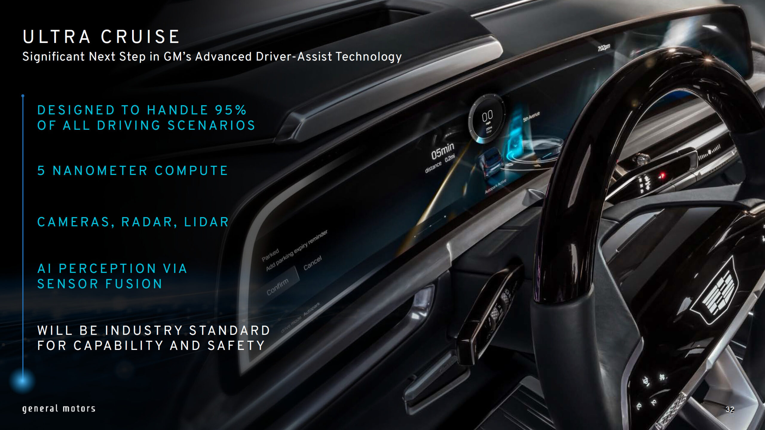 GM shared the first details of Ultra Cruise to be offered in 2023, a significant next step in hands-free advanced driving-assistance technology in the company’s journey to enable its goal of zero crashes, zero emissions, and zero congestion. Designed to ultimately enable hands-free driving in 95% of all driving scenarios, the company promised that Ultra Cruise eventually can be used on every paved road in the U.S. and Canada.