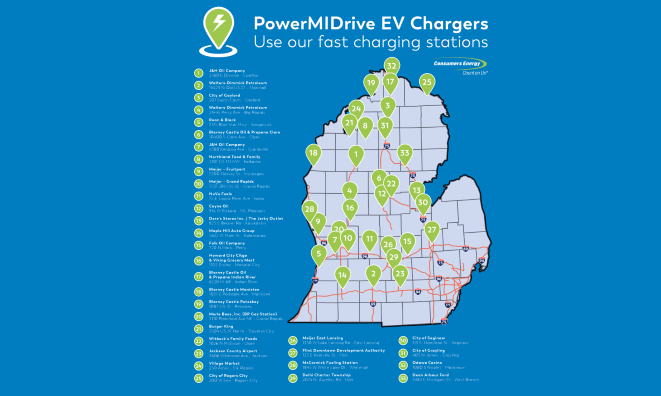 - Consumers Energy PowerMIDrive EV fast-charging stations map of Michigan.