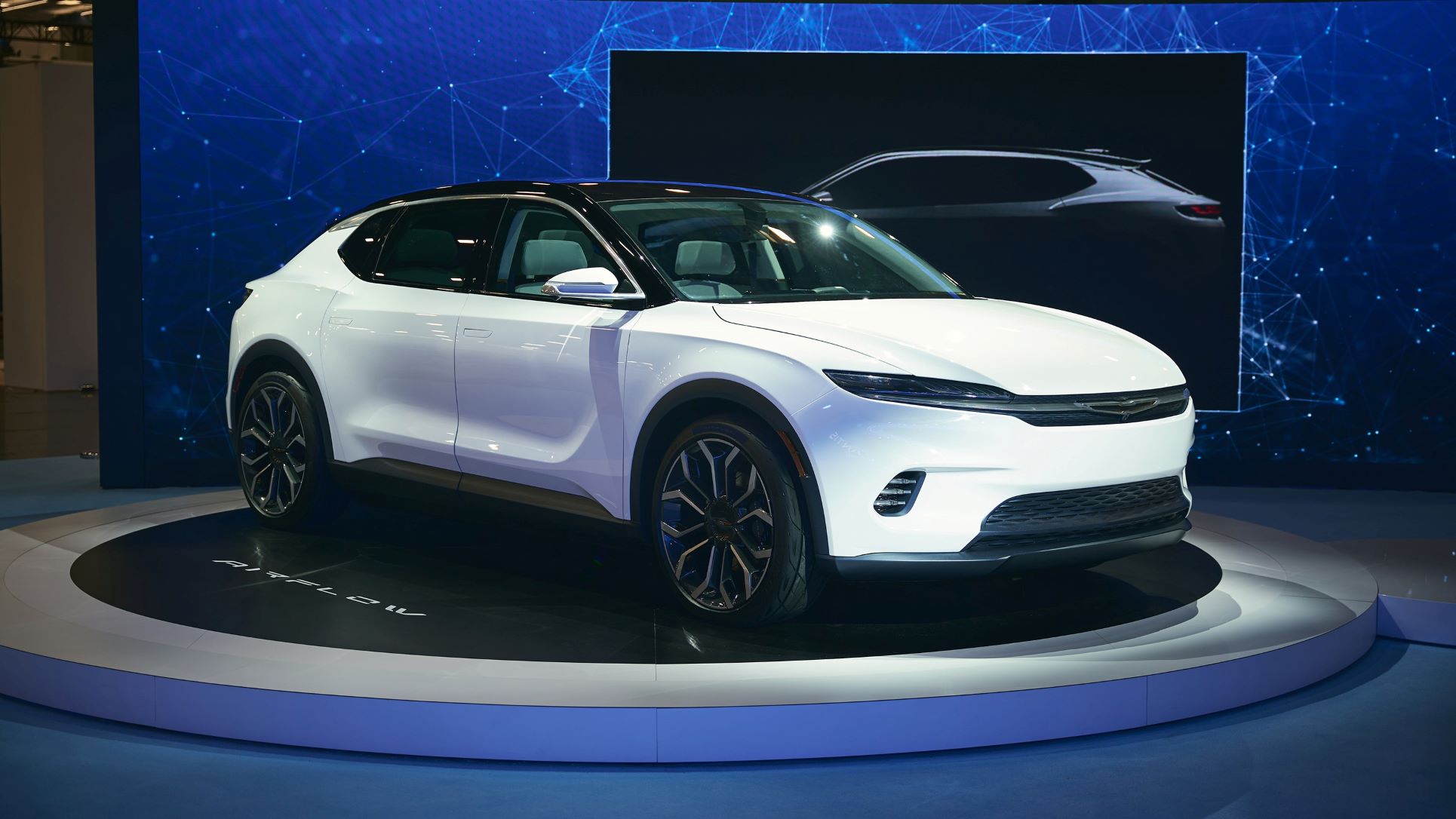 The concept features a low ride height and a streamlined, two-tone roofline that achieves “an elegant yet athletic profile while increasing EV range,” according to Chrysler. A long wheelbase and wide track, along with large 22-in wheels and tires, are enhanced visually with Celestial Blue accent color cladding.