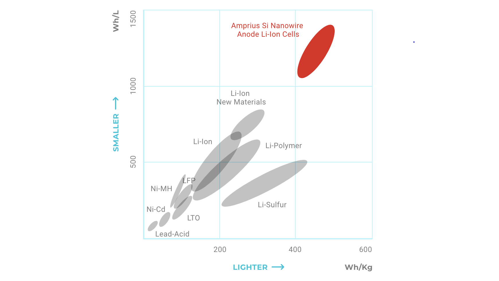 Silicon nanowires are connected directly to the substrate with no binders so there is nothing to block the flow of current. The silicon lithium-ion batteries can substantially improve the performance of electric vehicles, aircraft, drones, and wearables, from almost doubling the range of a Tesla Model 3 with a long-range battery to providing nearly 2.5 times the Urban Air Mobility flight times.