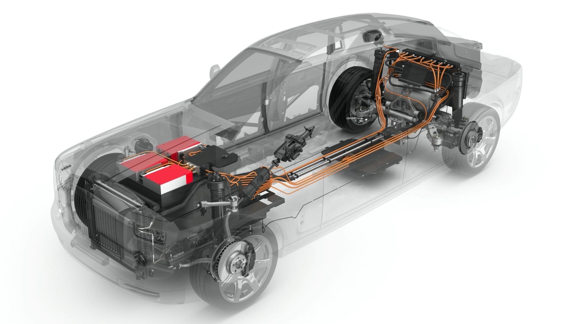 The spaceframe architecture is reinforced with steel sections and by integration with the battery structure for a 30% torsional rigidity improvement over existing Rolls-Royce cars. An aerodynamic channel for the battery and a smooth underfloor profile is enabled by placing the floor halfway between (rather than on top or below) the sill structures. The arrangement and moving of the bulkhead location enabled designers to create a low seating position and deepen the dashboard for an enveloping cabin experience.