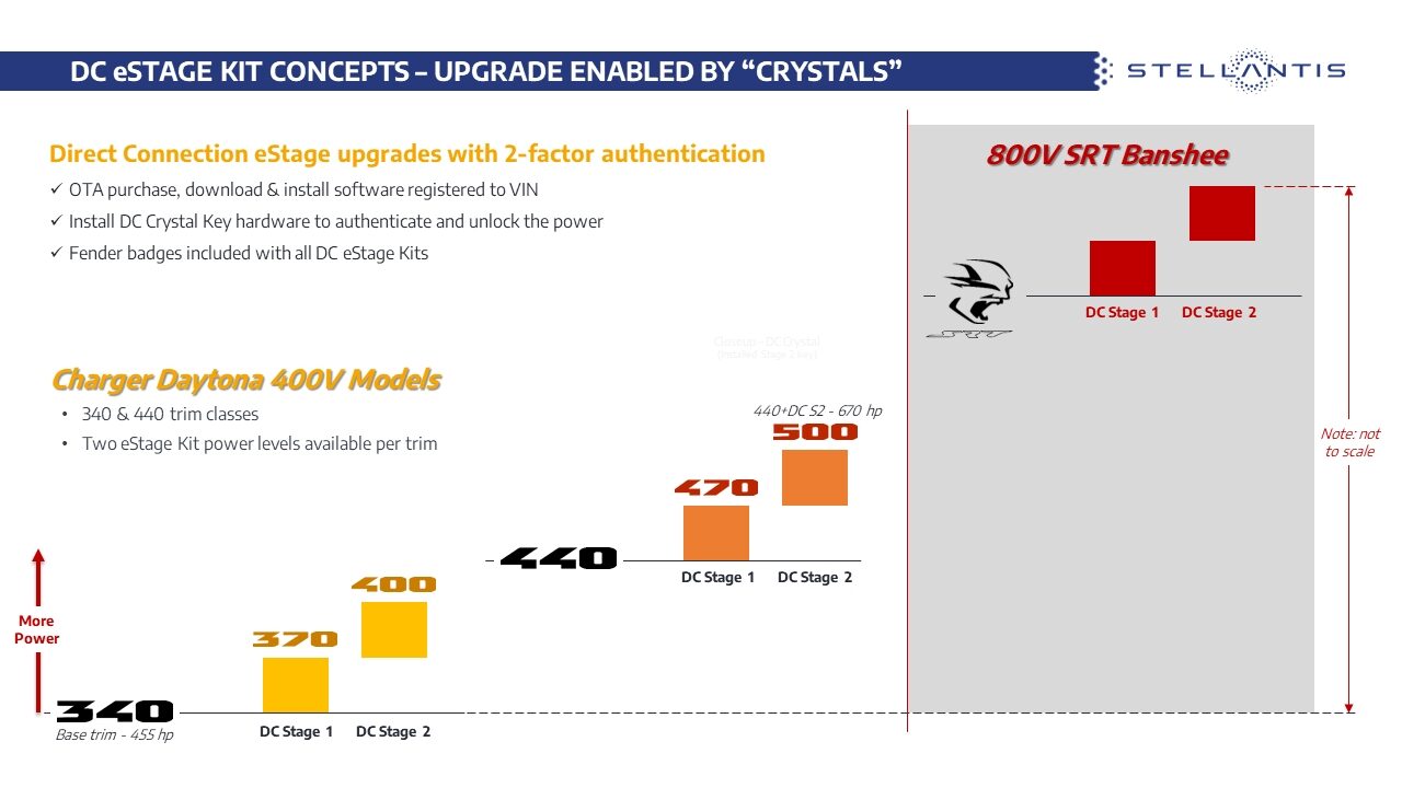 However, Dodge revealed numbers for only the two 400-V system output levels of 340 kW and 440 kW, with the factory-delivered, power-level for the 800-V SRT Banshee powertrain package to be announced in the future.