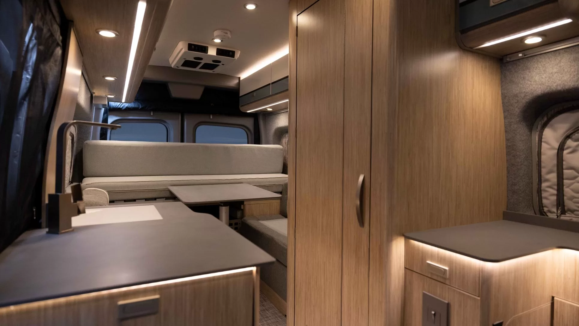 The eRV2 interior is inspired by modern Japandi principles, a fusion of Japanese and Scandinavian design that creates a clean, calm, and multi-functional environment. This includes a five-in-one sleep/lounge and two adaptable workspaces with built-in charge points and a high-speed Wi-Fi router for optimal data streaming. Broad-color-spectrum lighting allows users to customize the interior from white to red, which helps to reduce light pollution and negative effects on native flora and fauna.